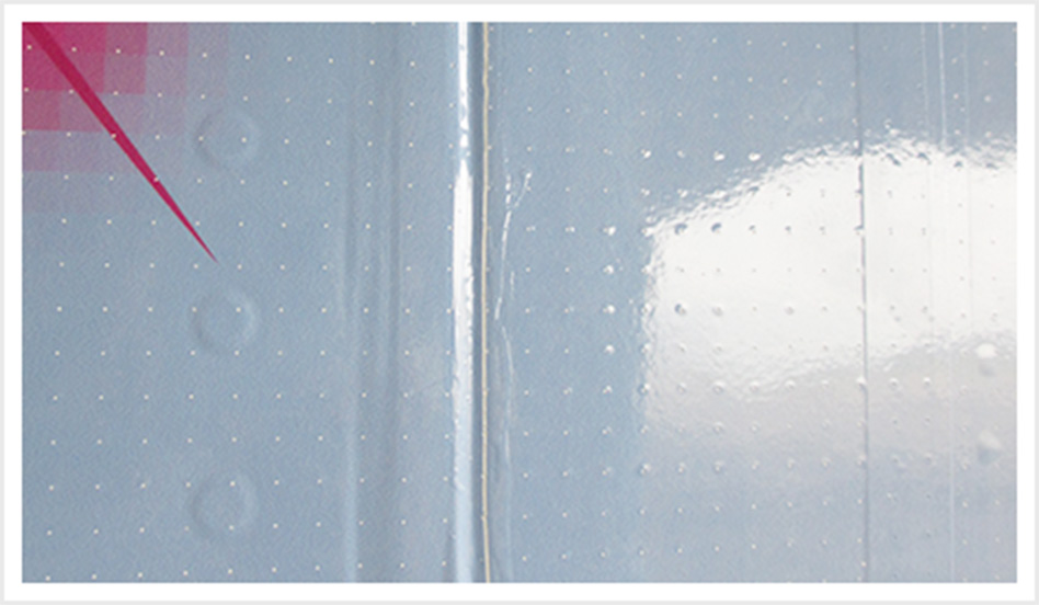 - 通常運用の環境下で、浮き・剥がれ・退色などが発生しづらく、曲面やリベット・パネル継ぎ目などにもに追従します。