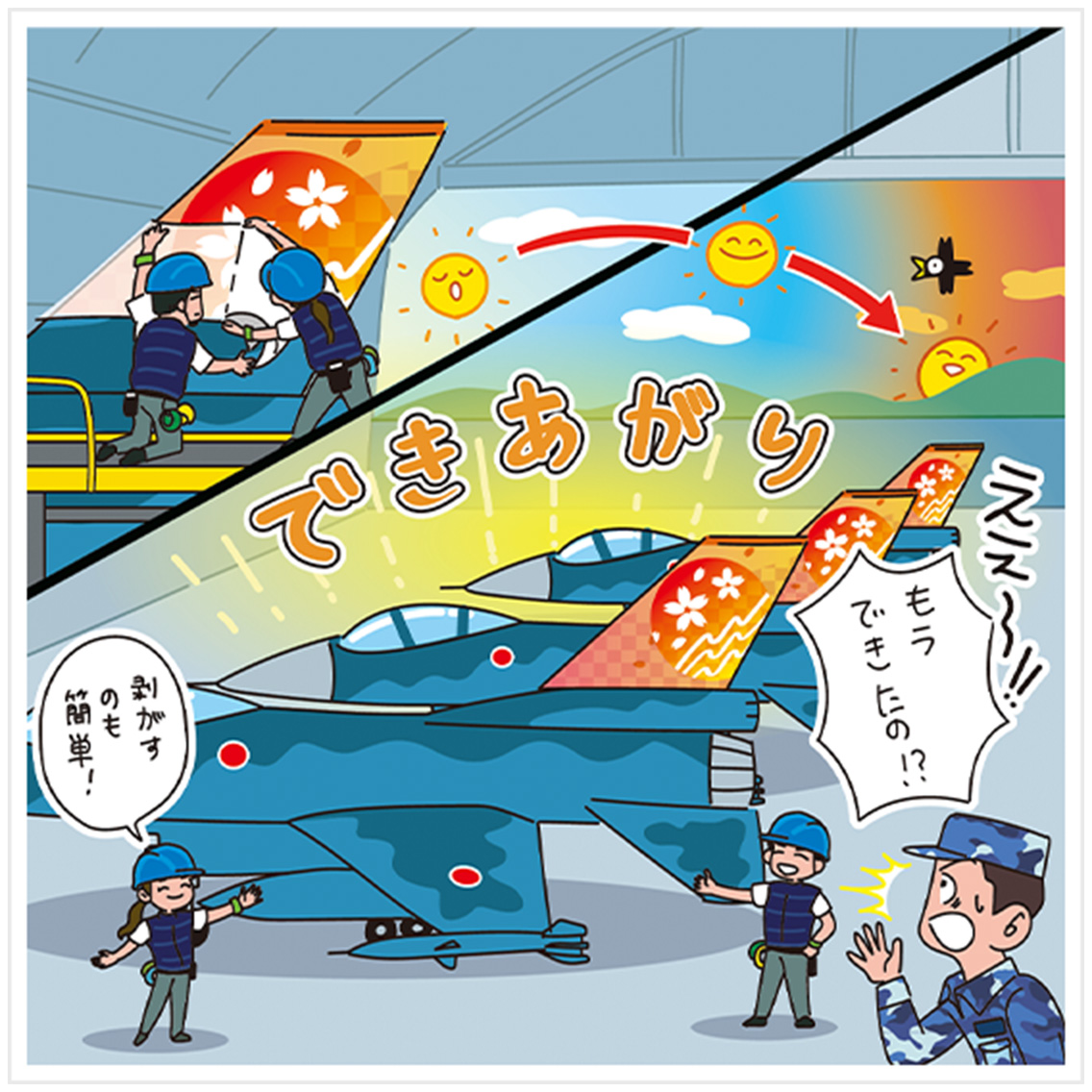 その実現手段は従来塗装のみでしたが、ここでもデカールのメリットが注目されています。2024年度のジェット戦闘機の特別塗装では機体デカールが採用され、実訓練運用を継続しながら、複数の基地で最長6カ月間の耐久性を実証しました。